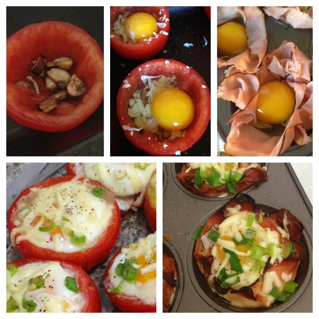We started by sautéing mushrooms with butter and thyme and putting them in the bottom of either hollowed out tomatoes or black forrest ham (double layered) in muffin tins. Then we sprinkled in gruyere and added an egg on top. We baked them at 400*f for (actually too long – don’t wait for the white to be solid, just set! We ended up with cooked-through yolks!) and then sprinkled on some pecorino romano and salt and pepper, let that melt, and voila!