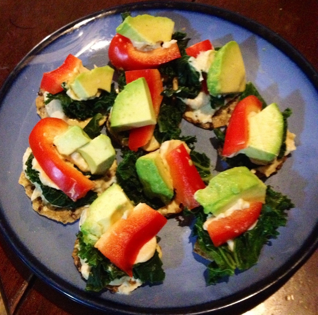 These bites were inspired by yesterday’s sandwich fiasco – because red pepper, hummus, sautéed kale, and avocado do go well together!