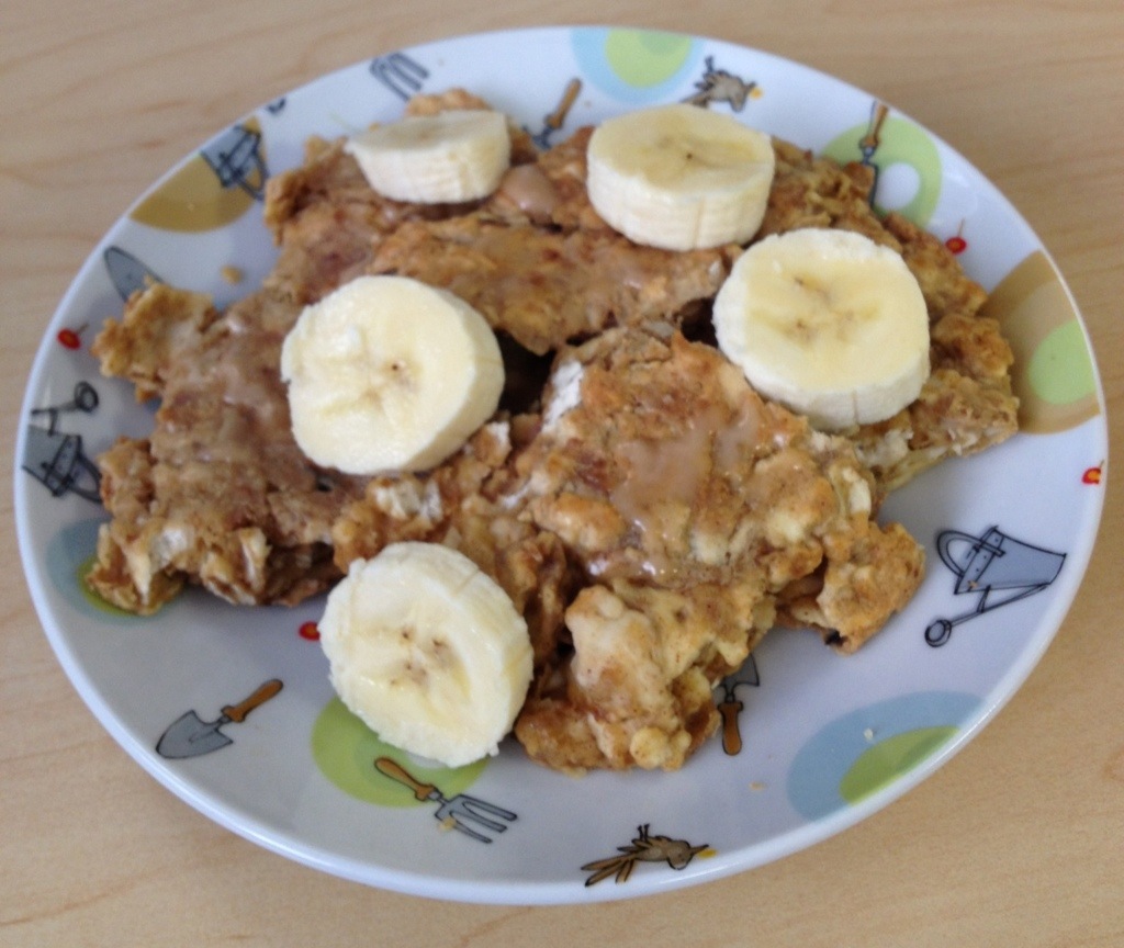 Anyway, this recipe from Parsley, Sage and Sweet (notice the lack of Oxford comma) basically just says to put almond (or peanut) butter in with the eggs that you mix with the matzah, and cook it like usual, and then top it with homemade jam.