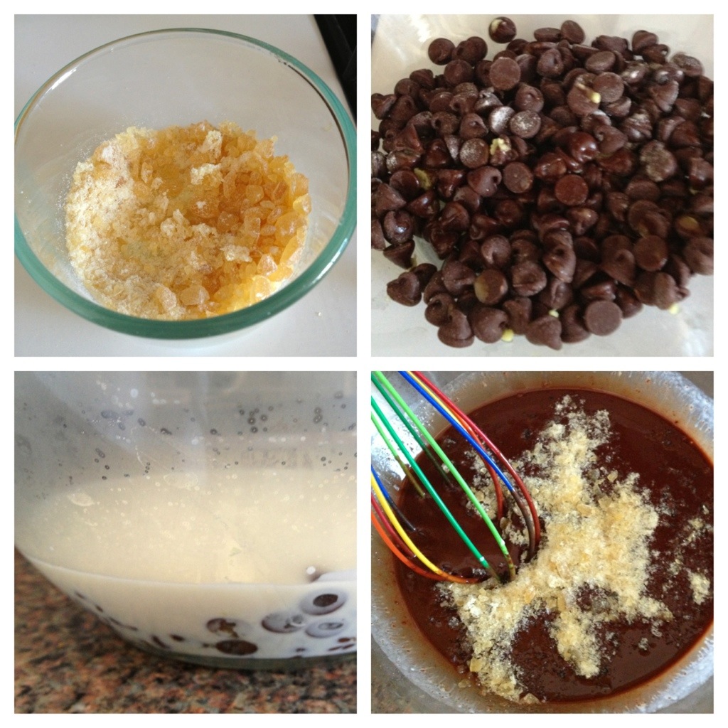 – Add the hot cream to 1 c semi/bitter-sweet chocolate chips and 1/4 tsp salt (and the juice from about an inch of grated ginger). Let it sit for a minute, and then whisk until smooth.