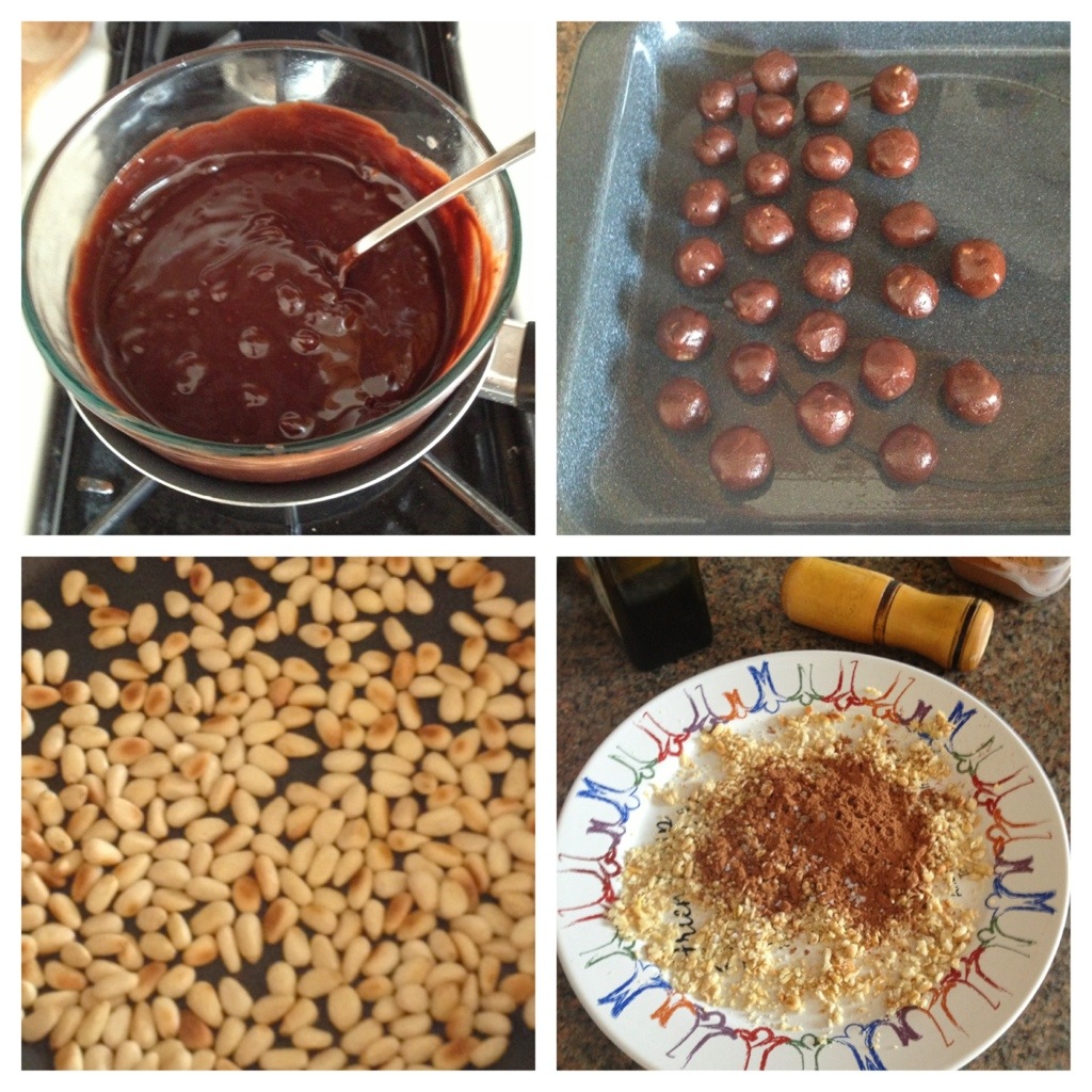 This substance hardened nicely in the fridge, and I was able to make perfect little balls and roll them in crushed toasted pine nuts, cocoa, and rock sea salt.