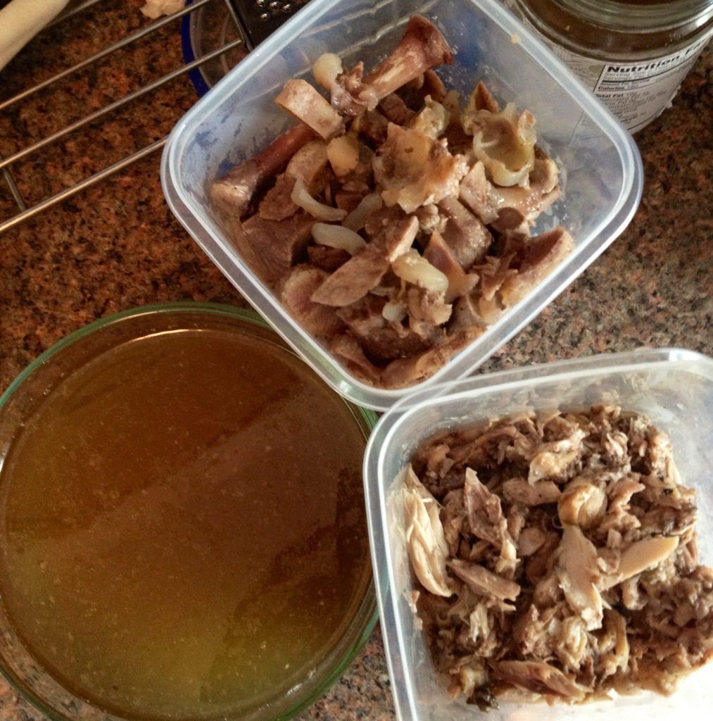 In the morning I skimmed out the broth, made one thing of soup using some broth, the dead veggies, and some of the meat, and then went to work on separating the bones from the soft stuff because I am planning to make bone broth at some point.