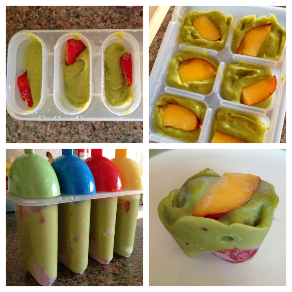 – The last thing I did was add fruit to the popsicles, because I’d seen that done somewhere and it looked really pretty! And with how thick the avocado is, you can suspend the fruit wherever you want! So I added some slices of strawberries and nectarines – just a couple in each one.