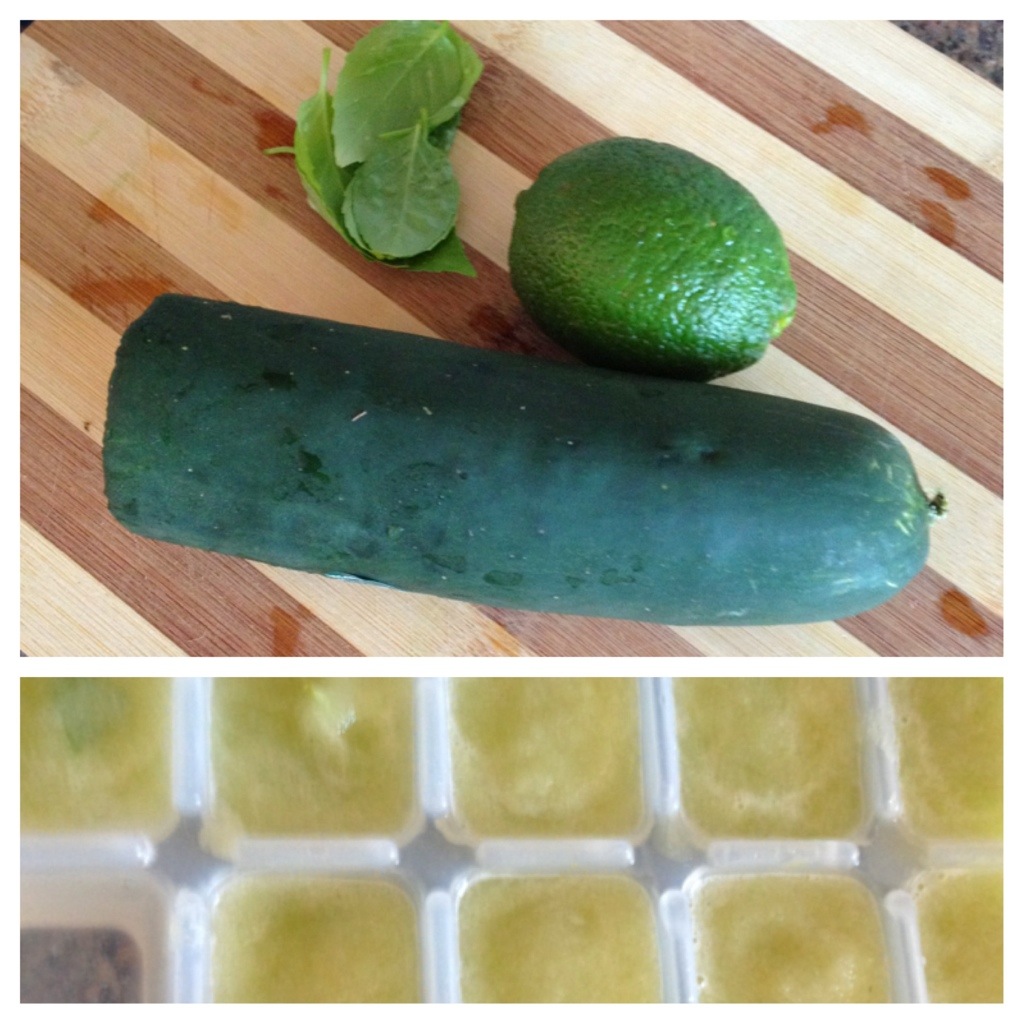 I puréed cucumber and lime together, added in chopped basil (I think mint would have been delicious too) and poured the mixture into an ice cube tray.