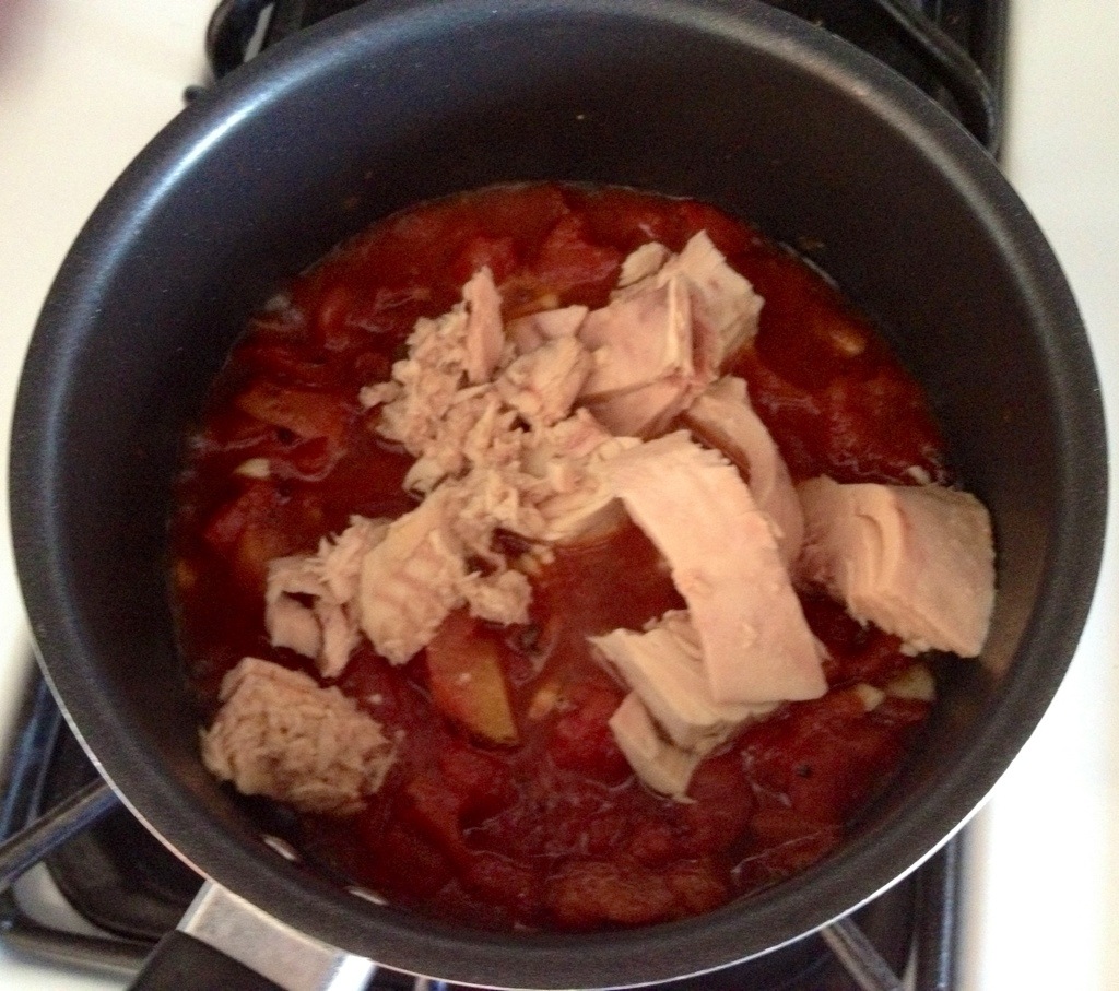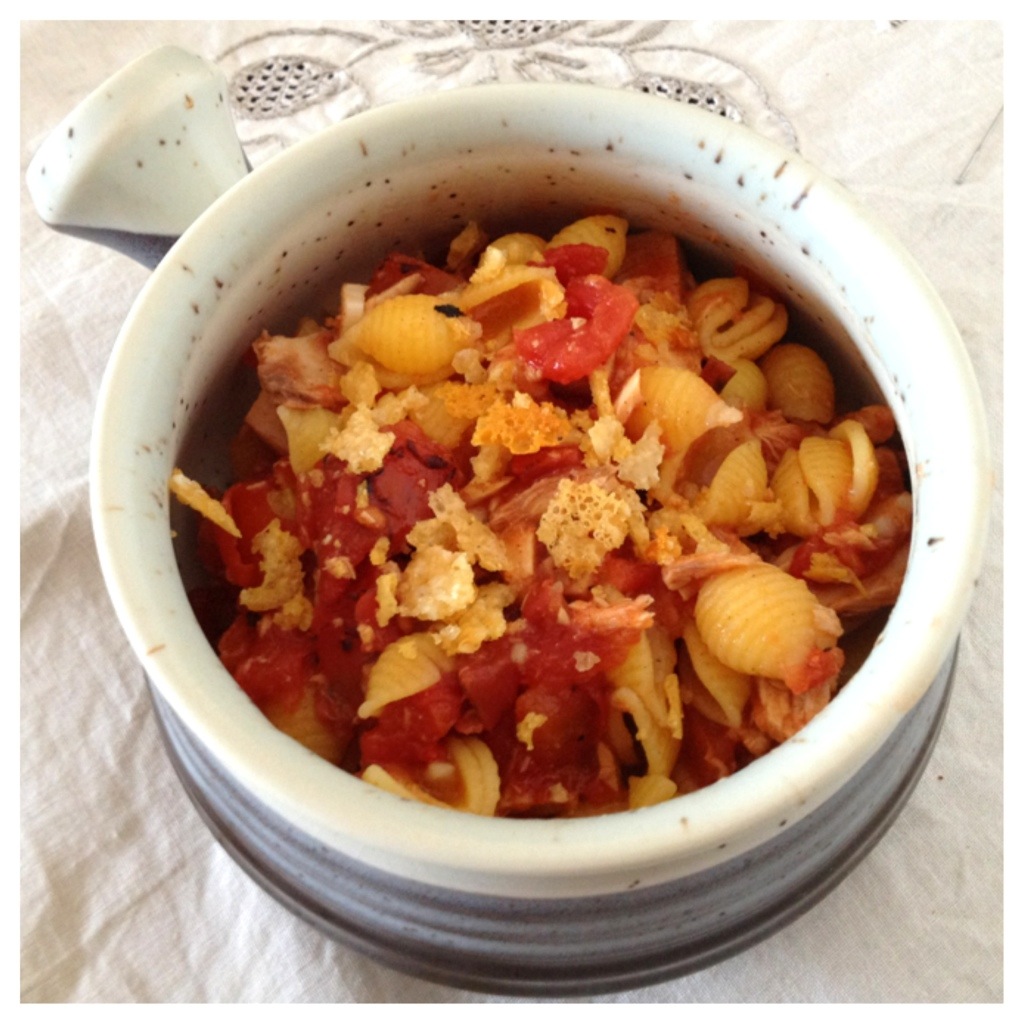 I had half a can of fire-roasted tomatoes with green chilies, left over from the Roasted Eggplant Soup, and I had some GF pasta and a can of tuna. And I found this recipe from The Lemon Bowl which seemed like it would work.