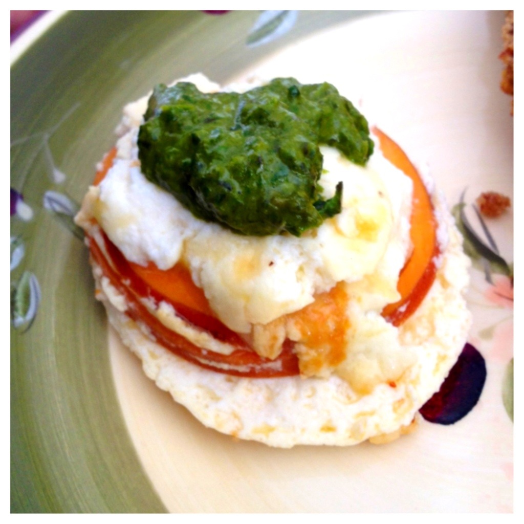 I started with this recipe for Farmhouse Baked Ricotta from Easy Peasy Organic which basically says to mix ricotta with pecorino, and then stick it in muffin tins lined with parchment paper, with a layer of thinly-sliced sweet potatoes in the middle of the cheese. Top with more pecorino, and bake at 400*f for 20-30 minutes. Then top them with a purée made of basil, olive oil, and lemon rind.