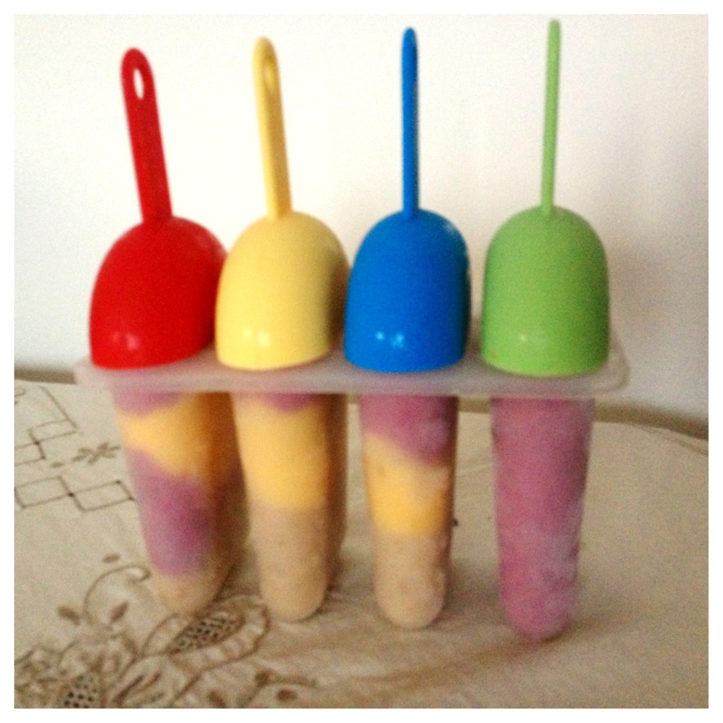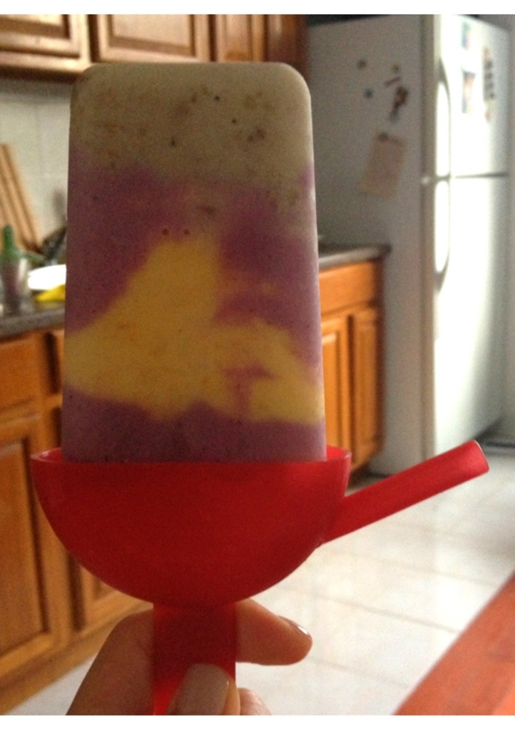 I’d read various places about using semi-frozen fruit and yogurt, which makes for a thicker consistency going in, to make stripes or shapes in Popsicles, so I tried to do that.