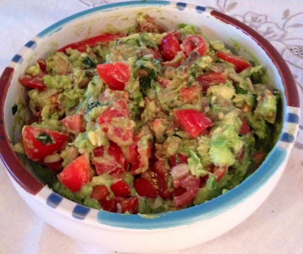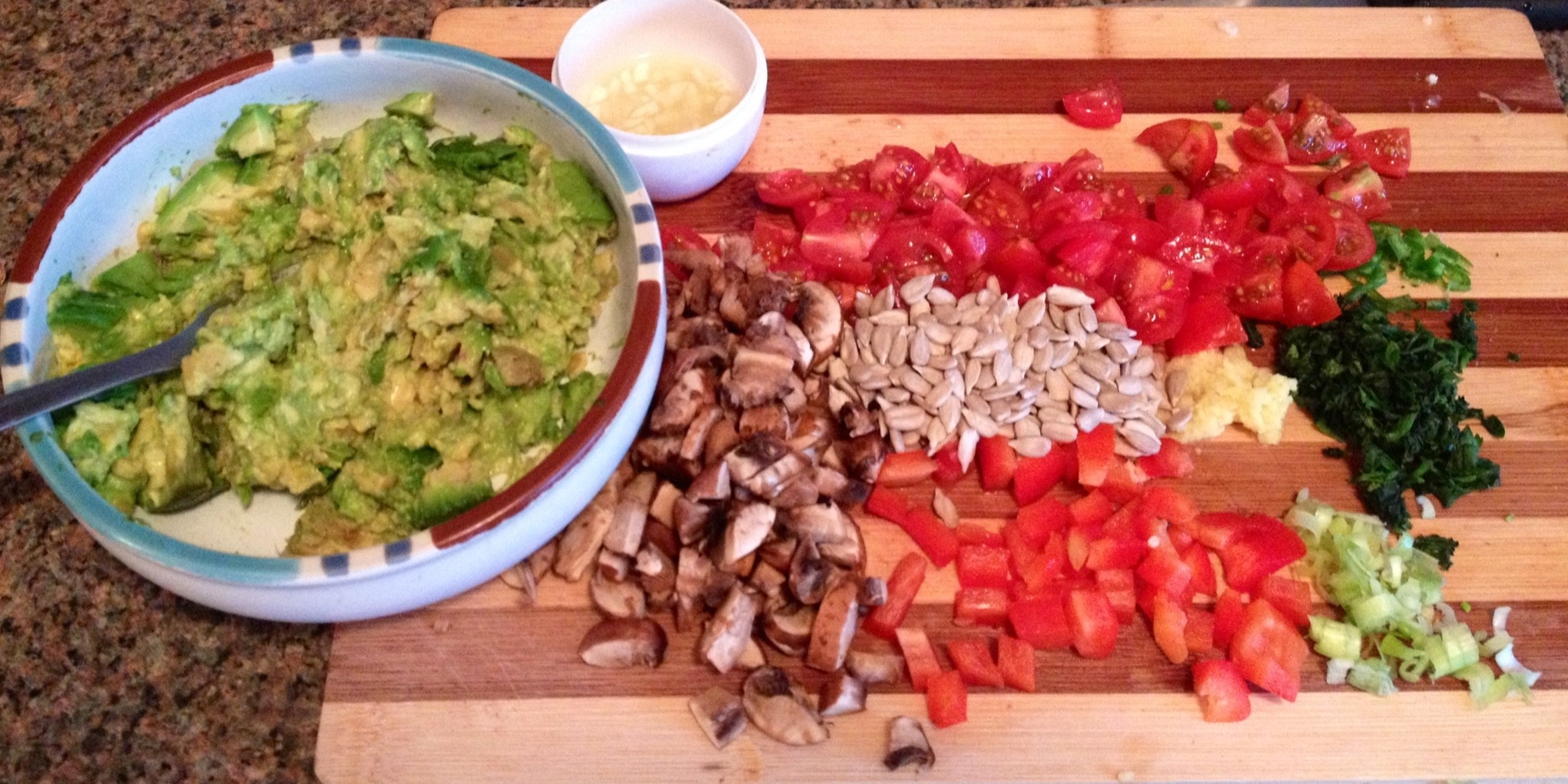 Almost anything goes well with avocados, as I decided to prove to myself here by adding all my leftover produce into today’s recipe. To be fair, this was also kind of inspired by this raw foods guac recipe from some random “cook” book years ago (sorry, don’t remember what) that really did call for everything, including sprouted black beans and olive oil, which I didn’t include this time. Here’s what went in: