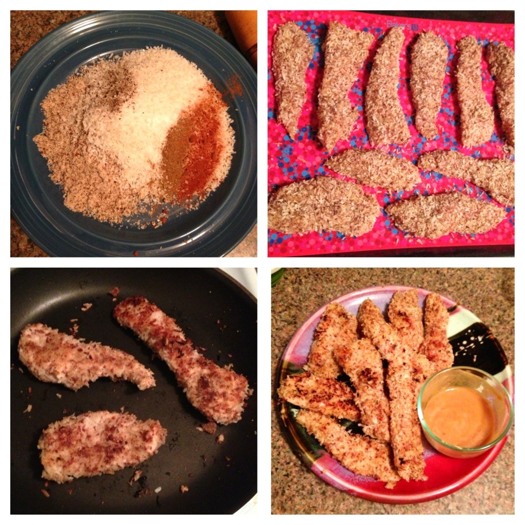 Normally I’m totally happy with what I can eat. But when I’m on a work trip in a small town or whatever and at the mercy of local restaurants and bars and I keep having to get a wimpy salad, or whatever, I start feeling sorry for myself. And the only thing I can do is promise myself that I’ll recreate whatever it is that I wish I could have when I get home. Hence chicken strips from Paleo Newbie!