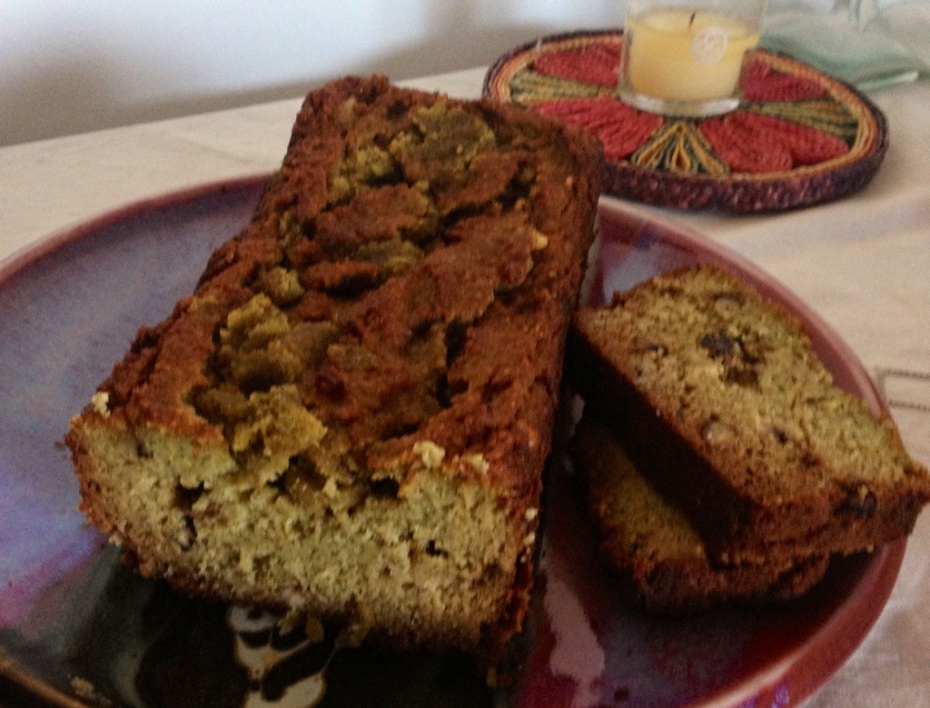 End result: heavy, decadent, not overly-sweet, super moist but still cut-able, green-tinted banana bread. Who knew!