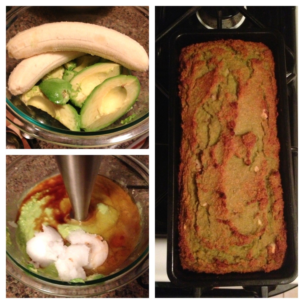 How does everything start? I googled ‘avocado’ and ‘banana’ and found this recipe from Living Healthy with Chocolate. I was chatting with a friend about it before I made it and she asked what the avocado was replacing, and I couldn’t think of what because there’s still egg and oil. Well, I think it should have replaced the oil because the result was so moist it was almost like pudding cake! There were other issues with it too, but it had good flavor and it’s an interesting idea, so I would definitely recommend experimenting with it. Basically this is it: