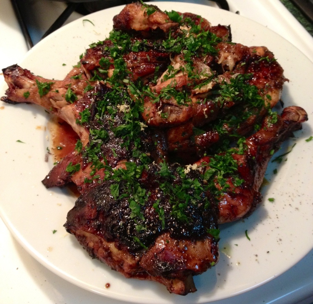 – Top the chicken with: parsley, lemon zest, finishing olive oil, finishing balsamic, glaze from the roasting pans, salt, and pepper