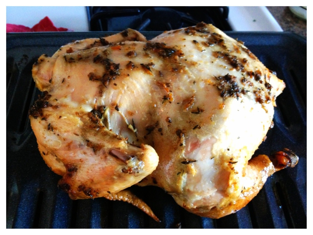 – Mix herbs with coconut oil and spread it on the inside and outside of the chicken. This (or using butter instead of coconut oil) was recommended by several recipes, but it really didn’t work, because even though I had rinsed and dried the chicken as best I could, the coconut oil kept it from sticking to the skin, so I ended up having to put dollops around.