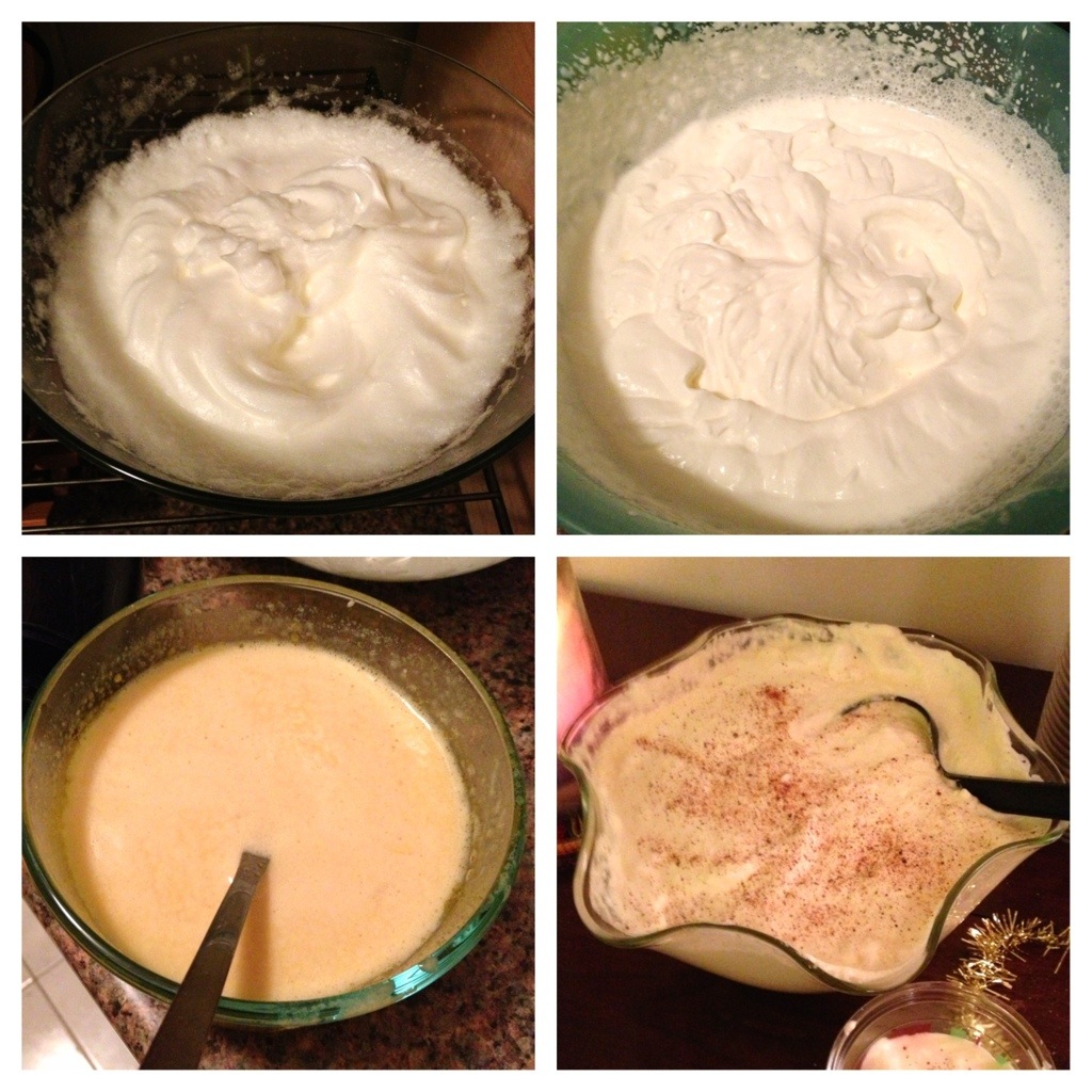 – Add in as much milk as you want to get it to a consistency that is drinkable. (Here was my main deviation from the recipe because at the outset I didn’t actually have milk, which they say you should add 2 cups of to the rum mixture before you fold it in. I just had about a cup of half-and-half, which I added and which did very little to thin out the fluffy eggnog. Luckily a friend on her way to the party picked up some milk, and I just added it in when she got there.)