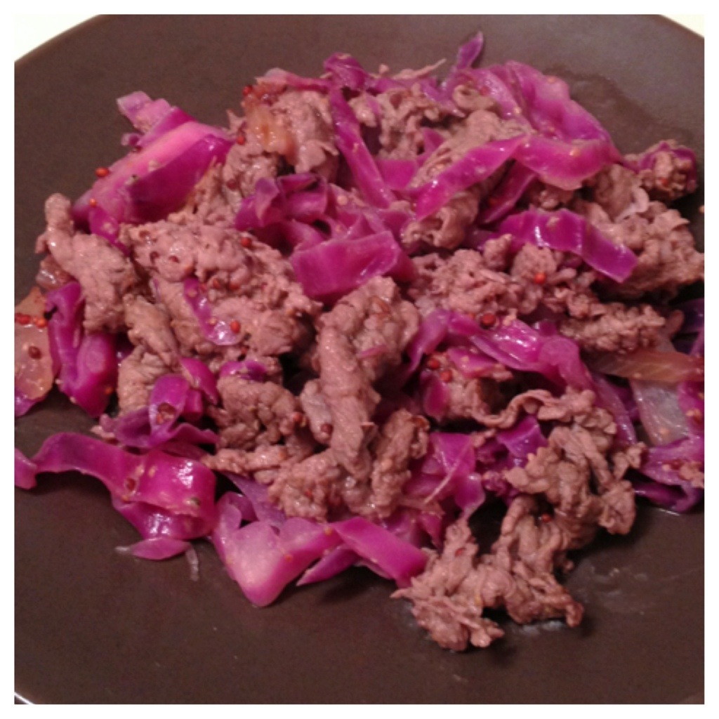 How do so many recipes start? I had red cabbage in my fridge, and I had just bought this thing of shaved beef, and this sampler of 4 different specialty mustards, and I wanted to make a stir-fry. All google inquiries talked about corned beef which wasn’t super helpful, so I struck out on my own – with surprisingly edible results!