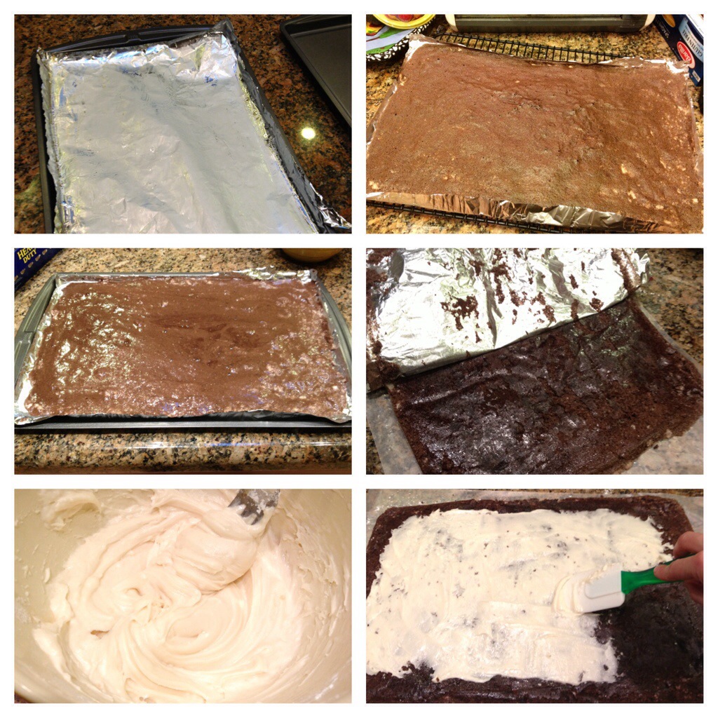 – Spread a thin, even layer of the frosting over the entire sheet. (Luckily, my friend Rebecca used to work at a bakery and at one time showed me how to spread frosting – basically start in the middle and work your way out, not applying too much pressure – I don’t know, for me it definitely wasn’t as easy as it looks – you end up tearing up the cake if you’re not careful! But it will still taste good)