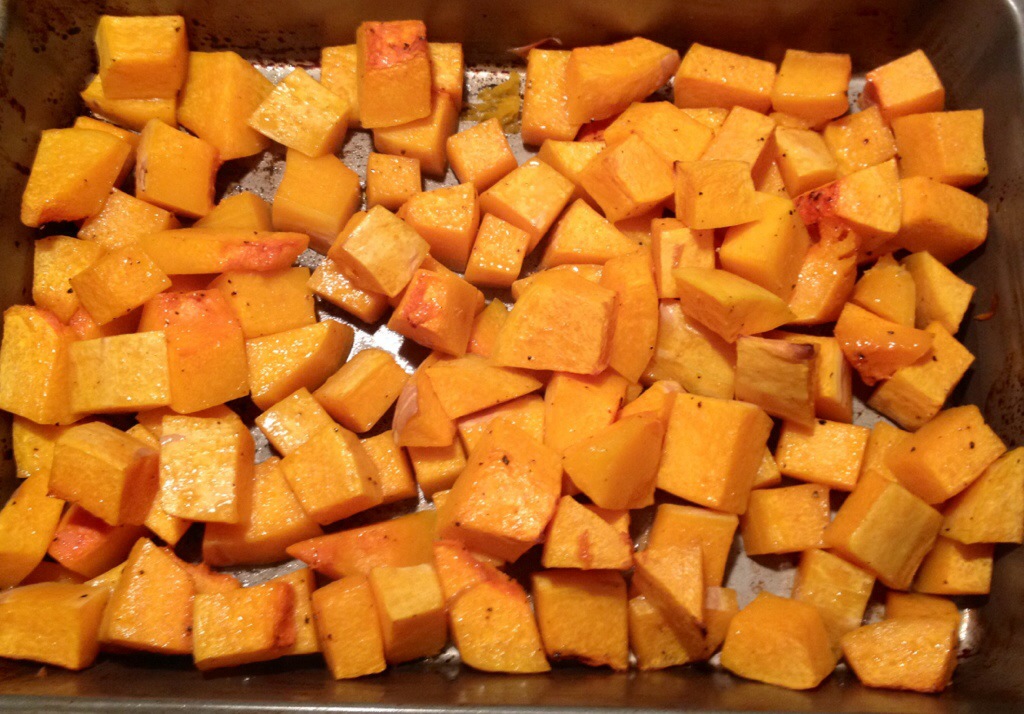 – Chop butternut squash and toss with olive oil, grape seed oil (optional, but I think it helps with the heat), salt, and pepper