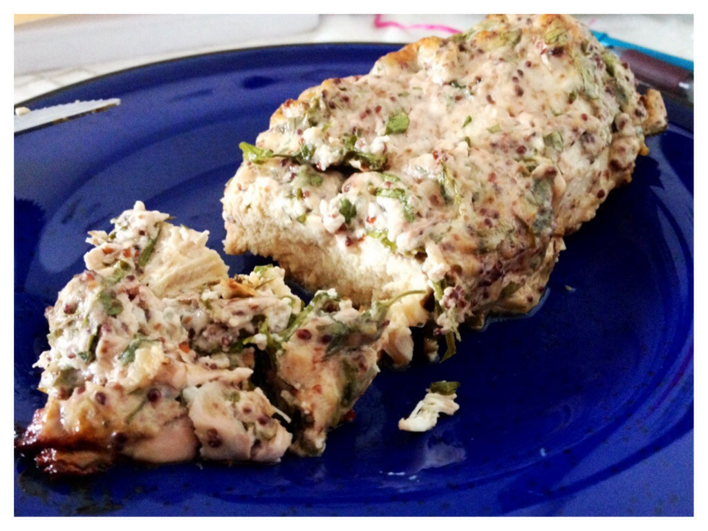 The recipe I found from Dashing Dish called for a lot of stuff I didn’t have, so I decided to spice it up with some blackberry mustard I had. I also put in grated gruyere, chopped parsley, and salt and pepper.