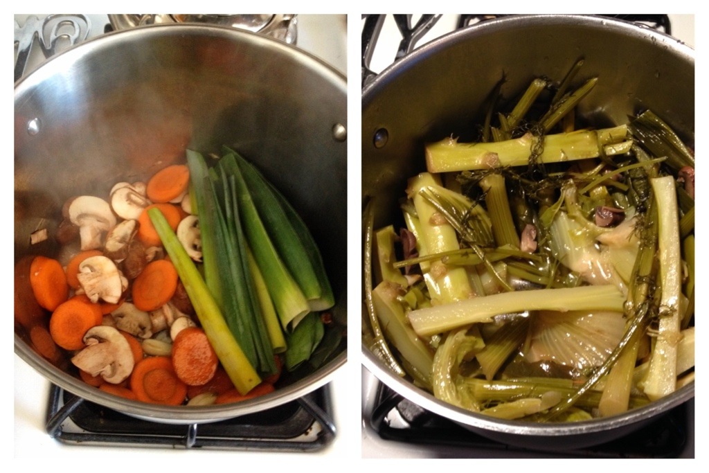 First I made a veggie stock because my dinner companion was not a meat-eater. Without onion and garlic, etc, I just boiled a bunch of vegetable parts – like broccoli and parsley stems, carrots, mushrooms, the butts and tips of leeks and fennel left over from the braised ones, a bay leaf, and some salt and pepper. It didn’t taste too exciting, but good enough, and definitely nutritious, and a great way to use all your bits of things!