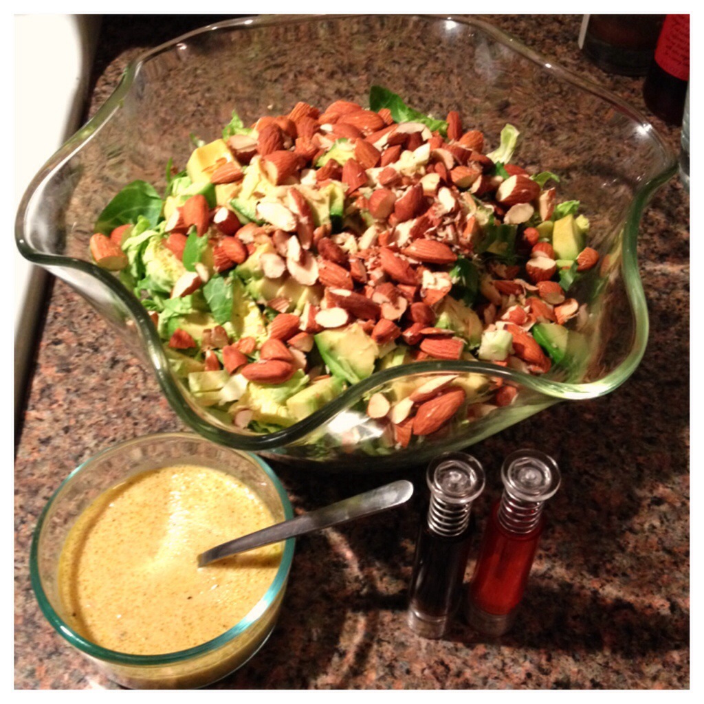 A friend of mine made this delicious brussels sprout salad which gave me the idea. Then I found this recipe from Epicurious for one that also included kale, but I decided to ignore that since I had just used up my kale in the massaged salad. No matter! The other issues were that it called for cheese, which I am temporarily omitting from my diet, so I decided avocado would make a good substitute because it’s creamy and rich as well – did not disappoint. Also I had the wrong mustard (Chablis instead of Dijon), but I don’t think that matters at all! So in the end it was: