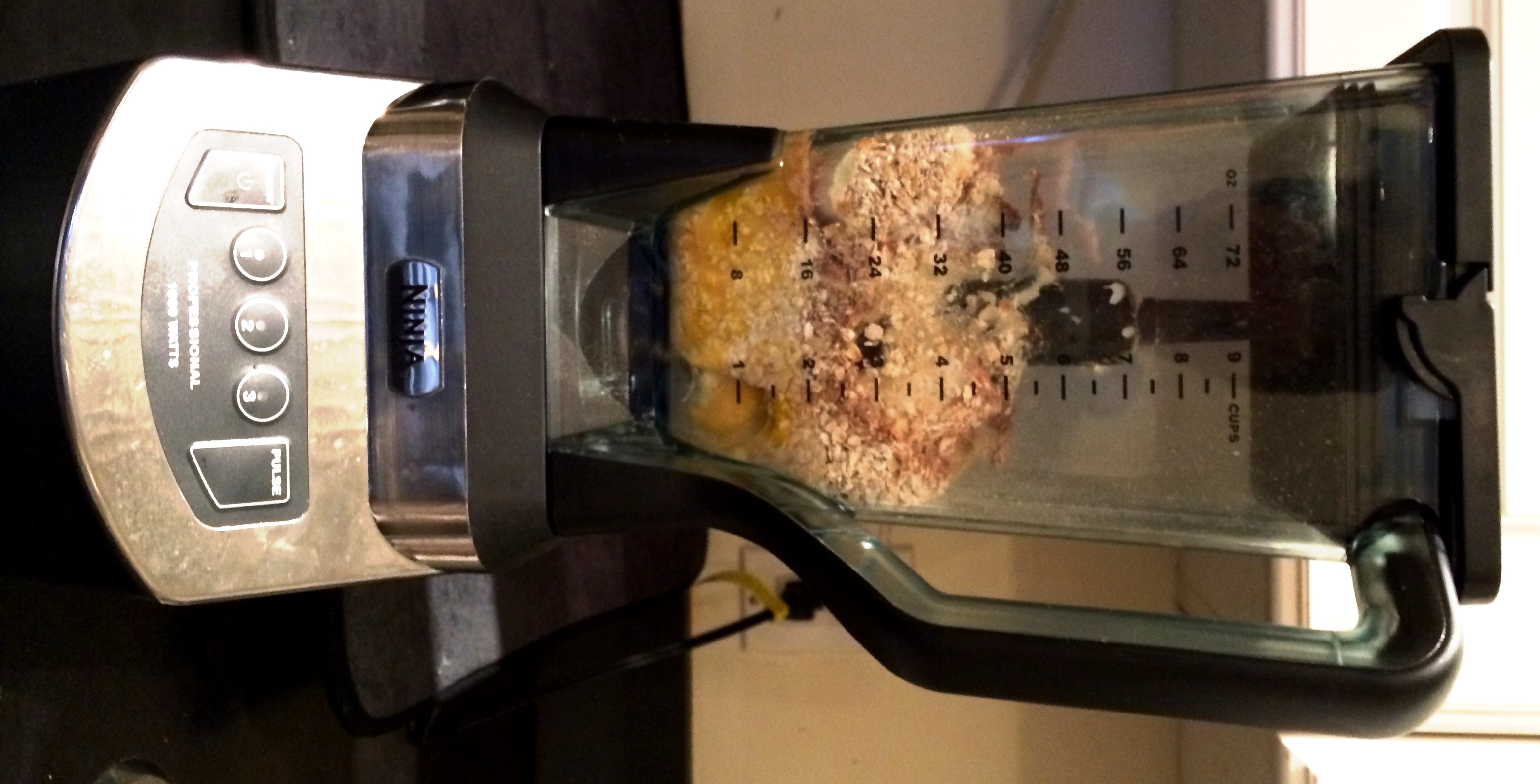 From here, it’s easy. Throw everything into a blender (this helps the oats get all ground up). If the mixture is too thick, add a bit more milk.