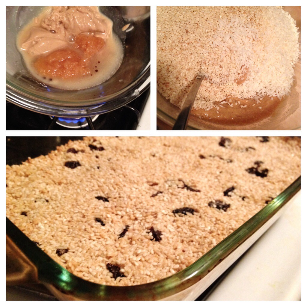 Warm the nut/seed butter and honey to facilitate mixing in the other ingredients (I just did this in a glass bowl held over the stove, because I’ve been creating too many dirty dishes lately, and I figured that if I kept it far enough from the flame that it didn’t burn my hand, then the bowl was probably pretty safe from explosion)