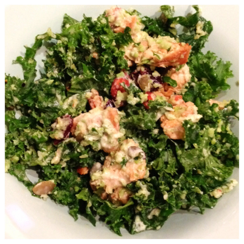 Kale, Broccoli, Chicken Salad with Yogurt Mustard Dressing