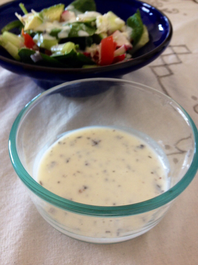 Kefir has a tangy, (almost blue-cheesy?) taste. You get used to it on it’s own, or you can sweeten or flavor it, or you can make it into salad dressing, like this one from Cultures for Health: