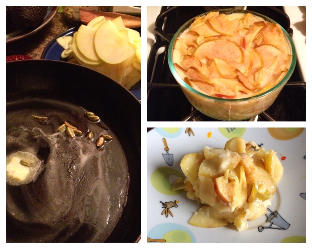 What to make for the new year this year?? I had this vision of a crispy apple layered thing dripping with honey, but I couldn’t think what that would be called… Anyone know? Anyway, I googled apple honey gratin and got this recipe from Joie de Vivre which seemed close enough – thinly sliced apples with honey and butter and egg, all baked in a ramekin. They then put the gratin between two cookies to make a sandwich, but I skipped that part. They also used lavender honey, which I didn’t have so I decided to cook the apples with cardamom pods – this didn’t produce the flavor explosion I was hoping for, so next time I would crush up the cardamom. Here’s how it went down: