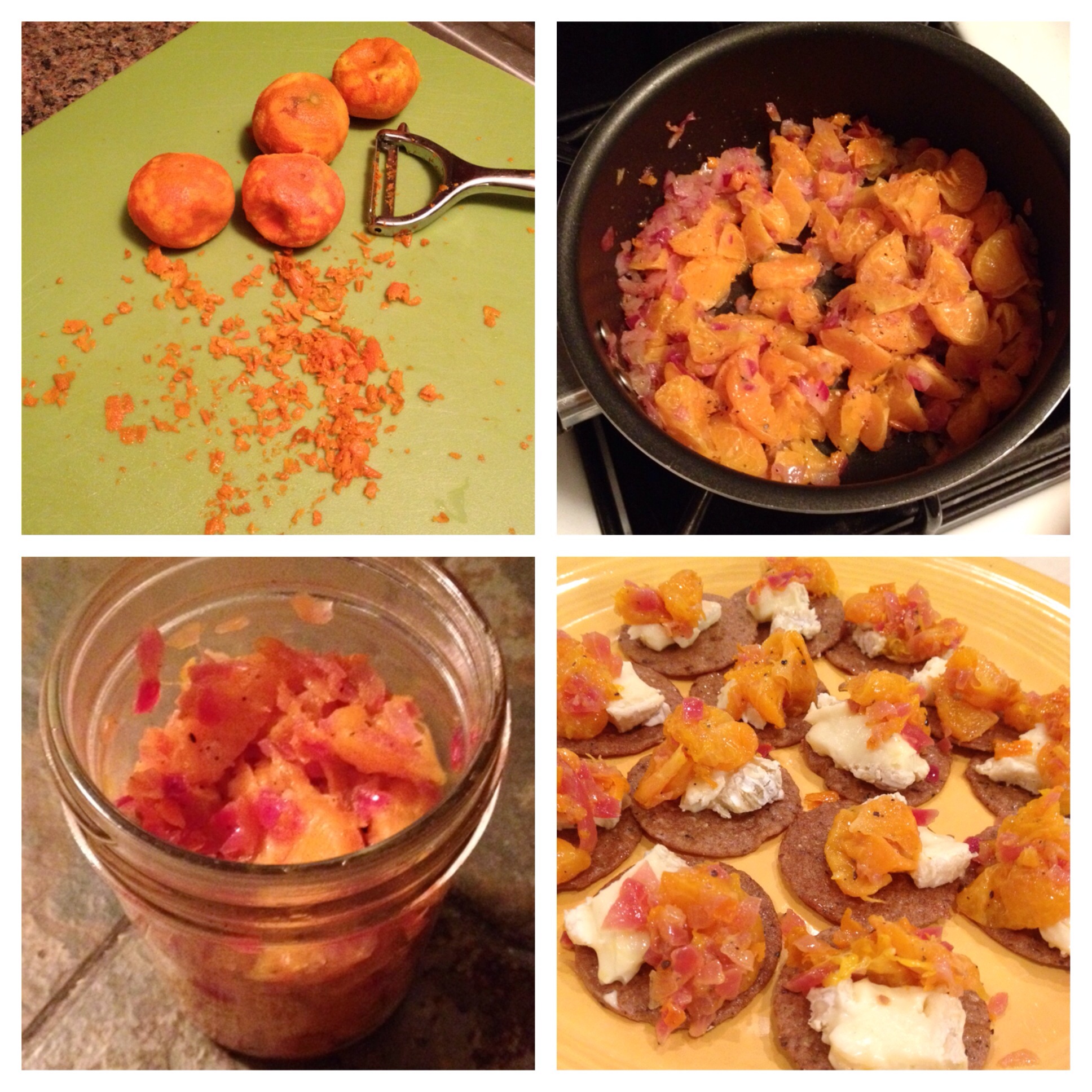 I had decided to bring crackers and Brie as an appetizer, but I wanted to kick it up a notch. Through my trusty Whole Foods app that works even underground on the subway, I found this recipe which seemed ordained from above because it called for ingredients I already had, including these clementines that were so desiccated I had already determined to throw them out, but then had gotten lazy and so they were still sitting on my counter, and the only possible utility for them would have to be something involving cooking! (Although truth be told, it might have turned out better if the clementines were fresher…). Also, my favorite sweet spice is cardamom and I can never find enough fun stuff to do with it. Here’s the recipe: