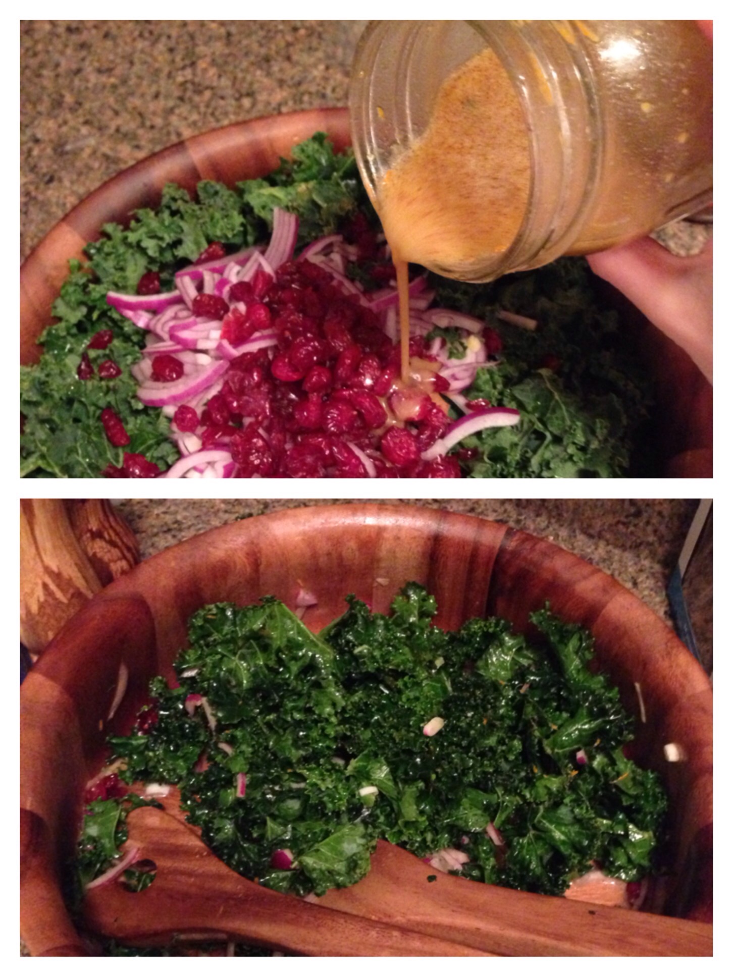 – Place chopped kale leaves in a bowl with dried cranberries and chopped red onion