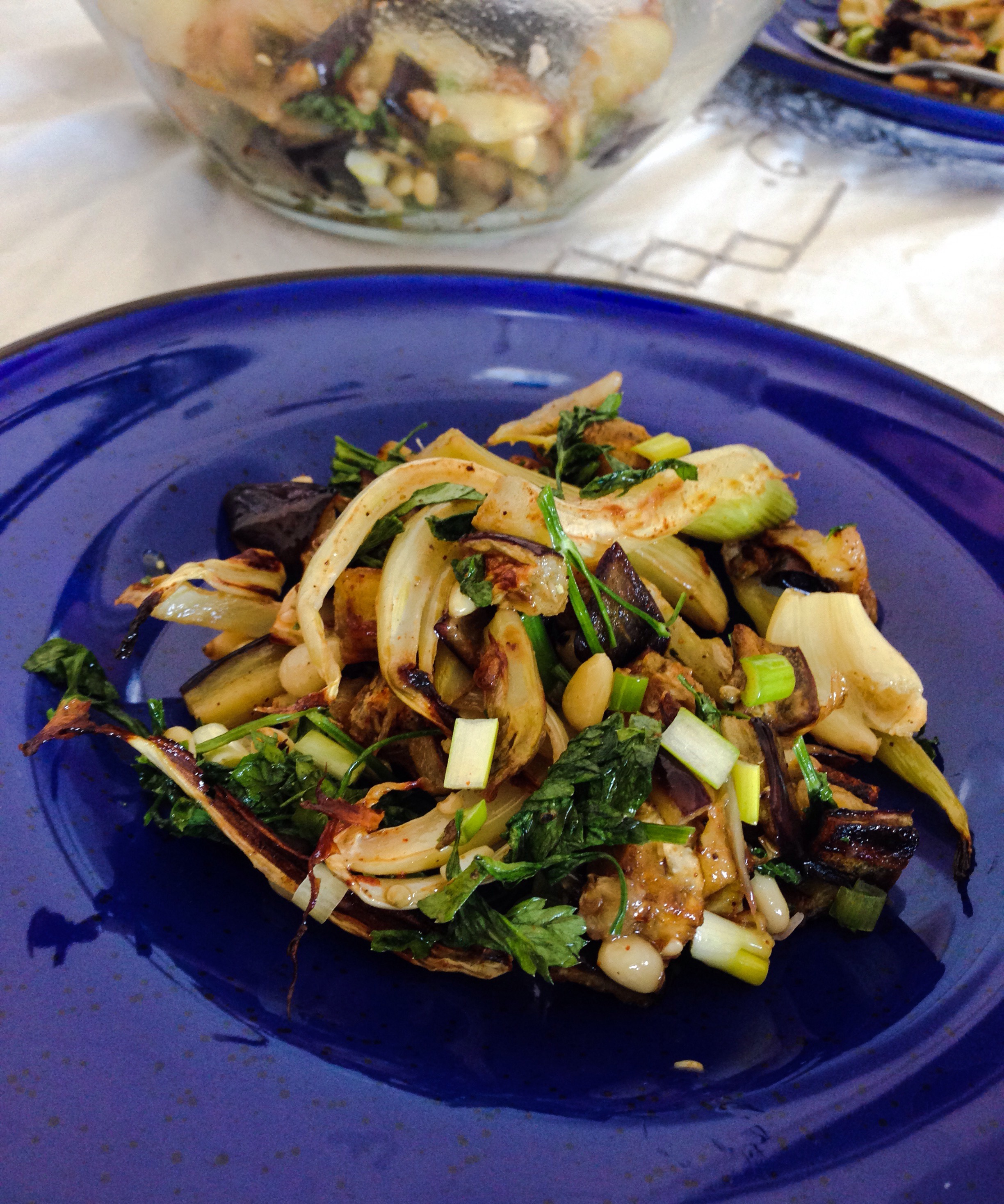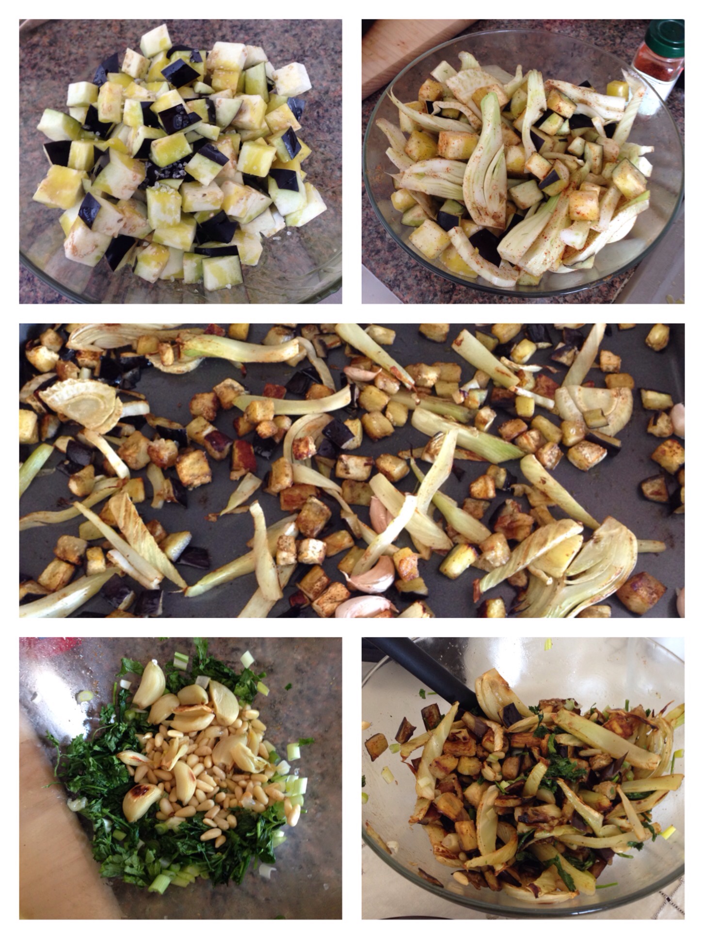 – Chop up herbs (in my case, some close-to-dead parsley) and scallions, and add in a bunch of pine nuts (which I happened to have from my last eggplant adventure!)