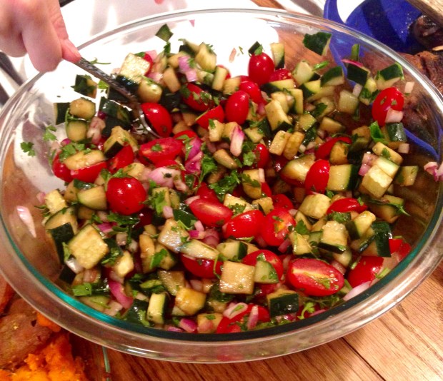Super easy summer salad – reminiscent of something Mediterranean, largely taken from this Epicurious recipe (using parsley instead of mint and using balsamic instead of red wine and not letting the cucumbers sit for nearly as long as they say…) Here’s how it went down: