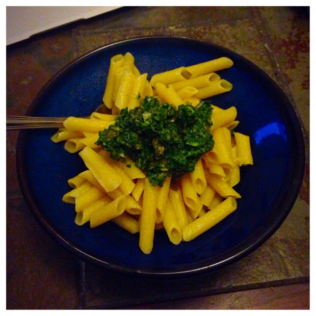 This week in my CSA haul I got 2 garlic scapes and 2 bunches of basil – and I had some gf pasta in my pantry and was in the mood for comfort food… Pesto it is! This recipe from Jeanette’s Healthy Living was so minimal, which was good because I didn’t have anything like parmesan or lemon or whatnot. All they say to do is: