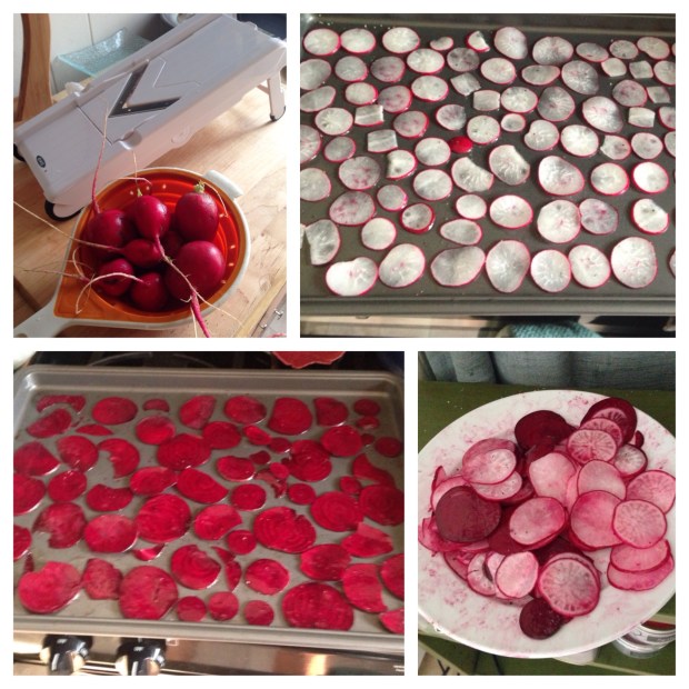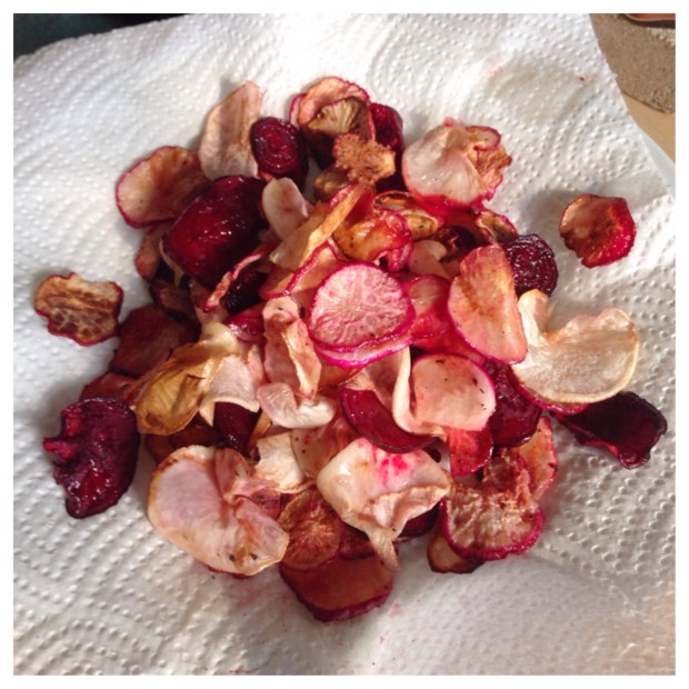 Oh CSA joy – so many radishes!! I still had some left over from 2 weeks ago, and then I got another bunch. And a bunch of beets. And I also had a couple salad turnips left from 2 weeks ago. And I’m going out of town!! And seriously, how many of these things can you eat in a salad before going crazy? BUT eating chips is easy, and I cooked up all of these things in the course of 2 hours (and will probably consume them just as fast). The original recipe from She Makes a Home is just for radishes, but I was correct in assuming that it would work for other roots. Here’s how it went: