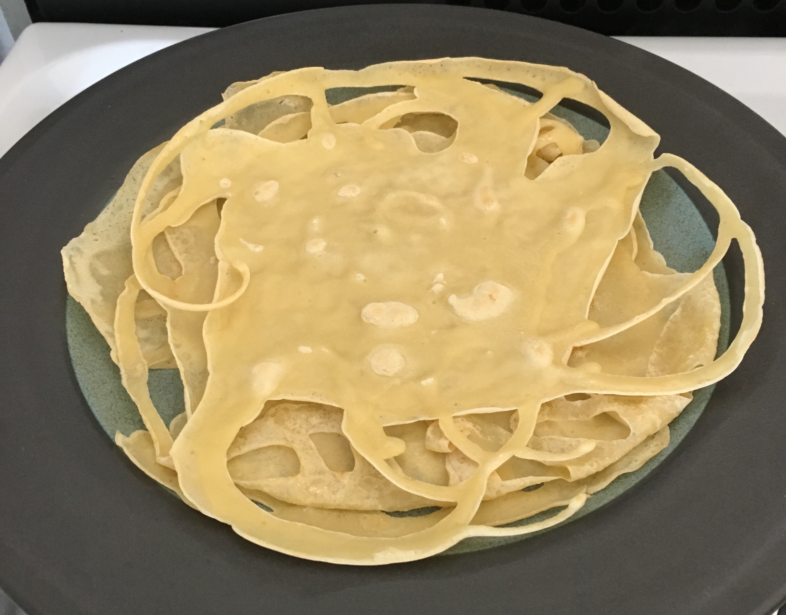 *My first batch was the tapioca one, and my crepe-swirling skills certainly improved as I went. Although I do kind of like the lacy effect of not using enough batter…. not sure how that will work in a cake, but I may just decide to find out!