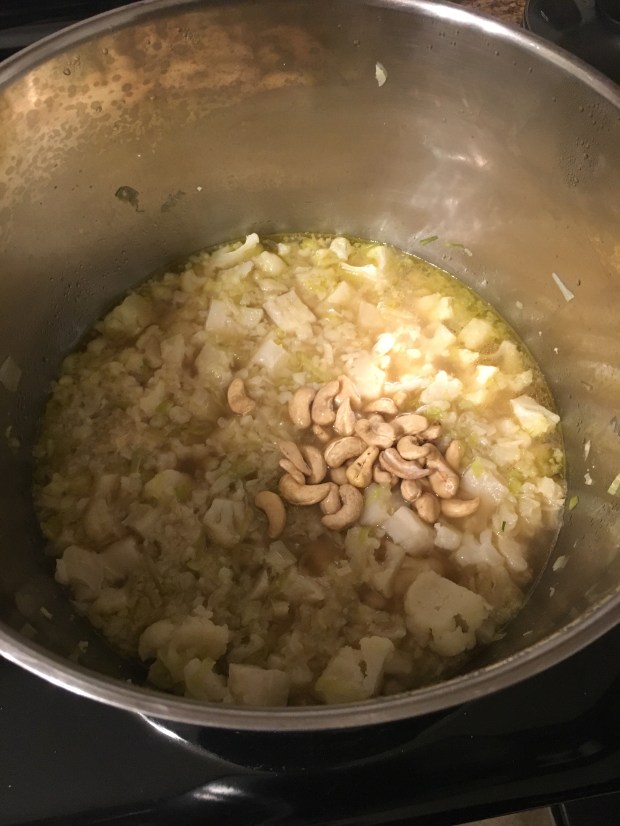 – Remove from heat then add in 1/4c raw nuts. I used cashews, she says blanched almonds or macadamias work too
