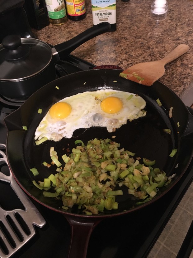 Leeks!! I had two halves left over from my soup, and I’m heading out of town so I had not much else… but I have toast! And almost everything else for this recipe from bbc good food:
