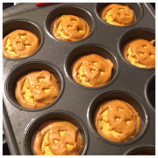 I also added a drop of red food coloring to my muffin batter and a drop of yellow to my dead dough to make a stronger jackolantern effect.