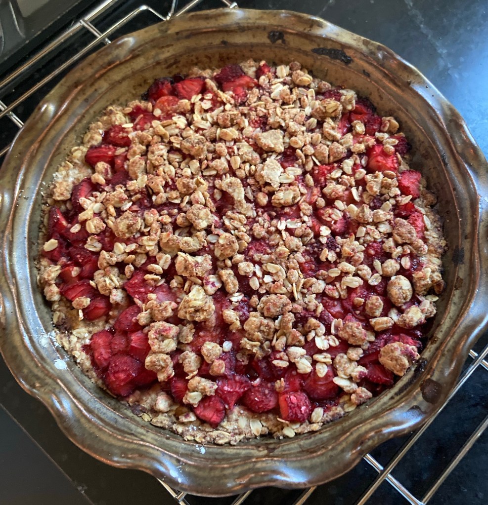 We basically followed the recipe but used frozen strawberries that we defrosted (we reserved the juice to use as a “sauce”); we used coconut sugar instead of brown sugar and turbinado instead of granulated; and of course the pie plate (and no parchment paper, just some non-stick spray).